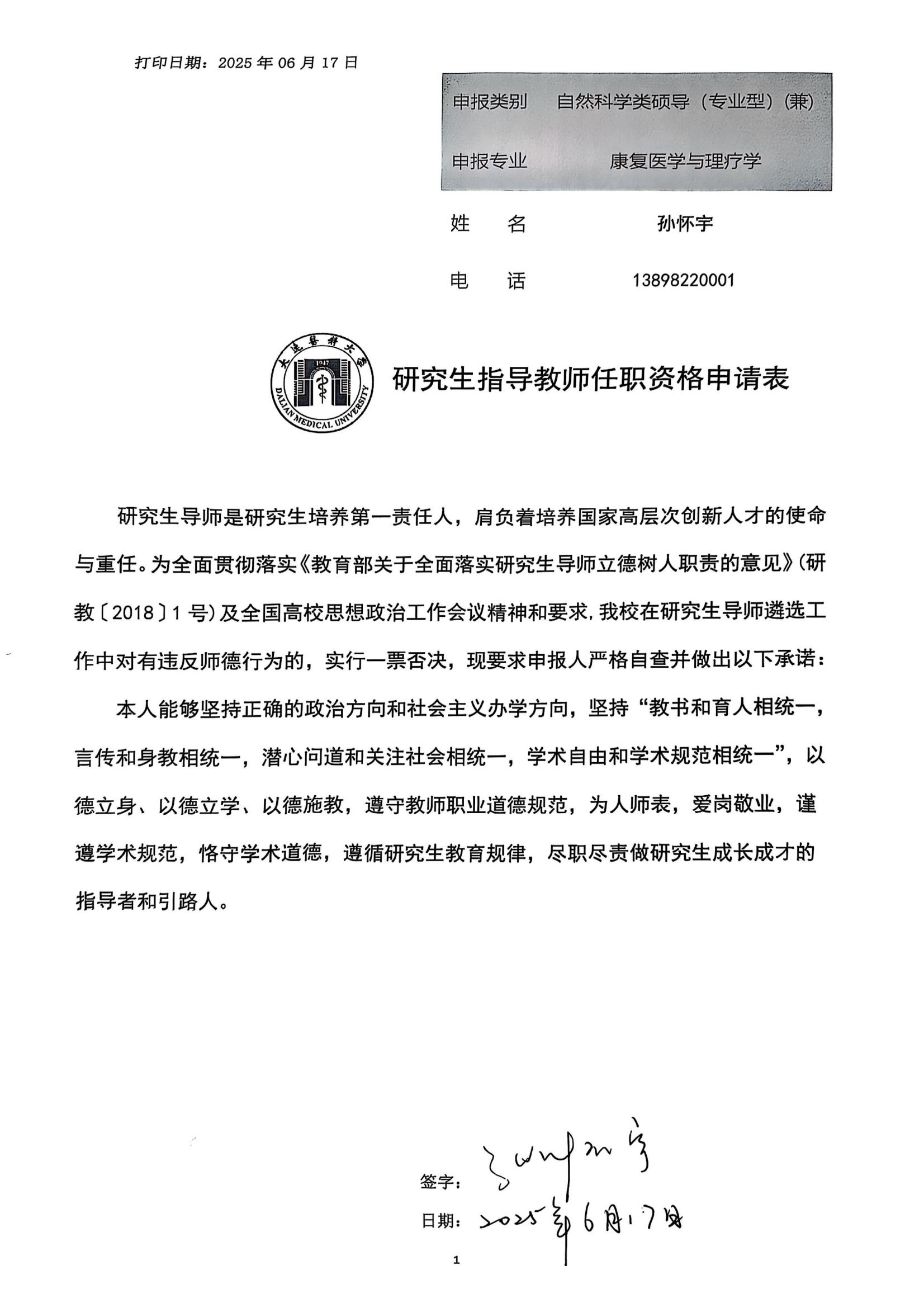 关于孙怀宇同志研究生指导教师任职资格的公示